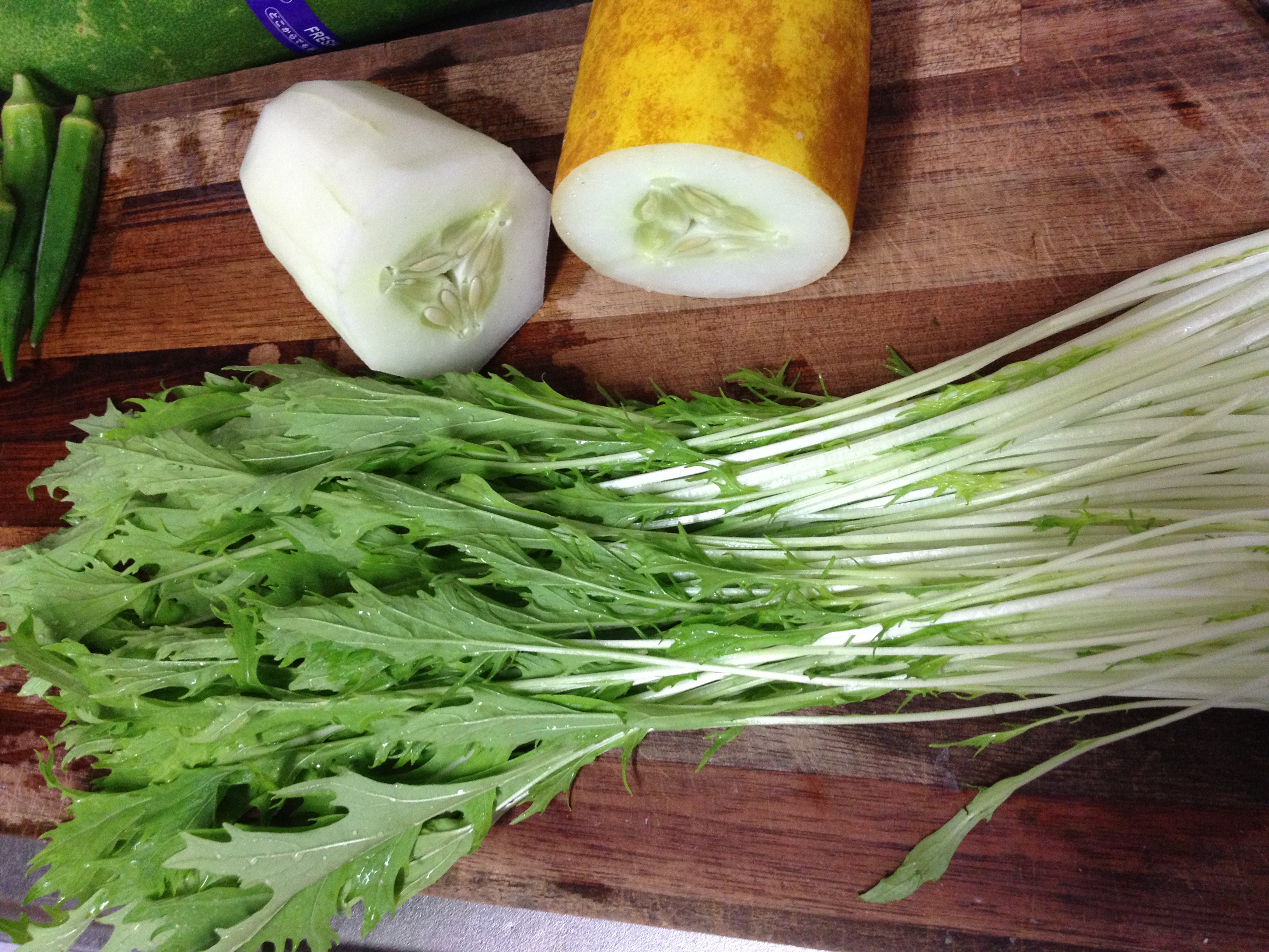 I went to the local farmers market and came back with a bunch of summer veggies that I wanted to experiment with. You’ll probably be seeing some of these in upcoming posts. I’ll be using Okinawa varieties of produce, but I’ll list substitutions next to the ingredients in case you don’t have access to the same produce. I’ve also included picture of these ingredients and the label in case you are in Japan.