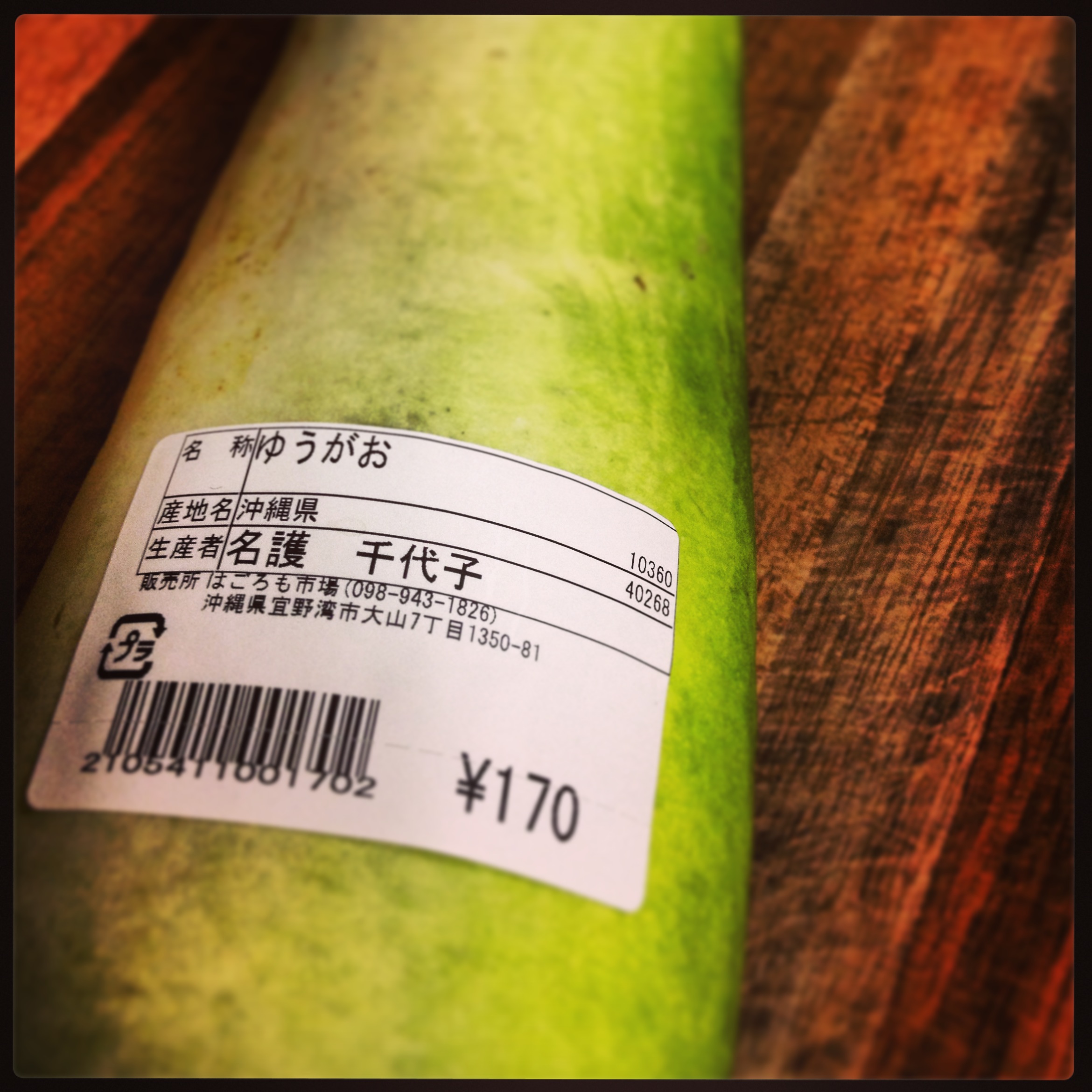 I was inspired this week to try some new Okinawan summer veggies. I saw this huge green vegetable, with a sticker price of around $1.75, and decided that I must learn to like this, based on the price alone. I stood there in the middle of the market, entering kana into my Japanese translation app to discover that yuugao is bottle gourd! Then I Google what the heck a bottle gourd is good for. Apparently, they make delightful liquid vessels once they’re dried. Also, people eat them. I’m off to a good start!