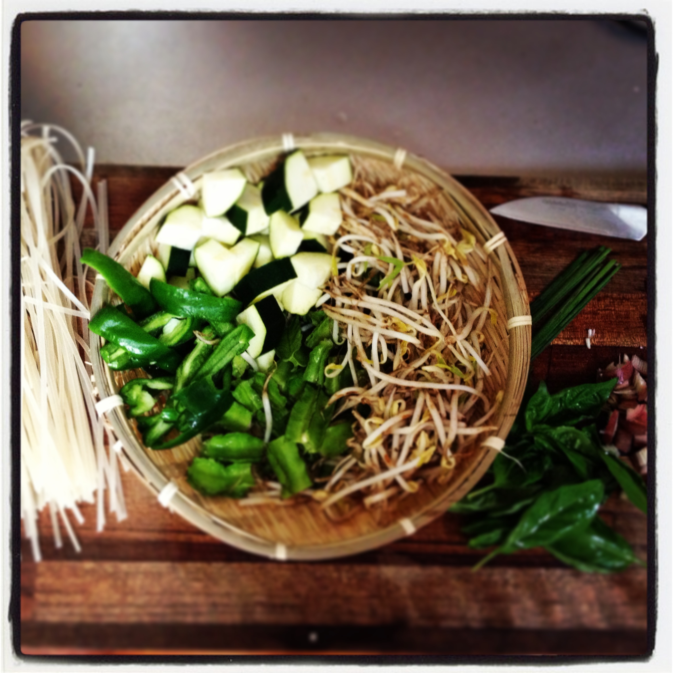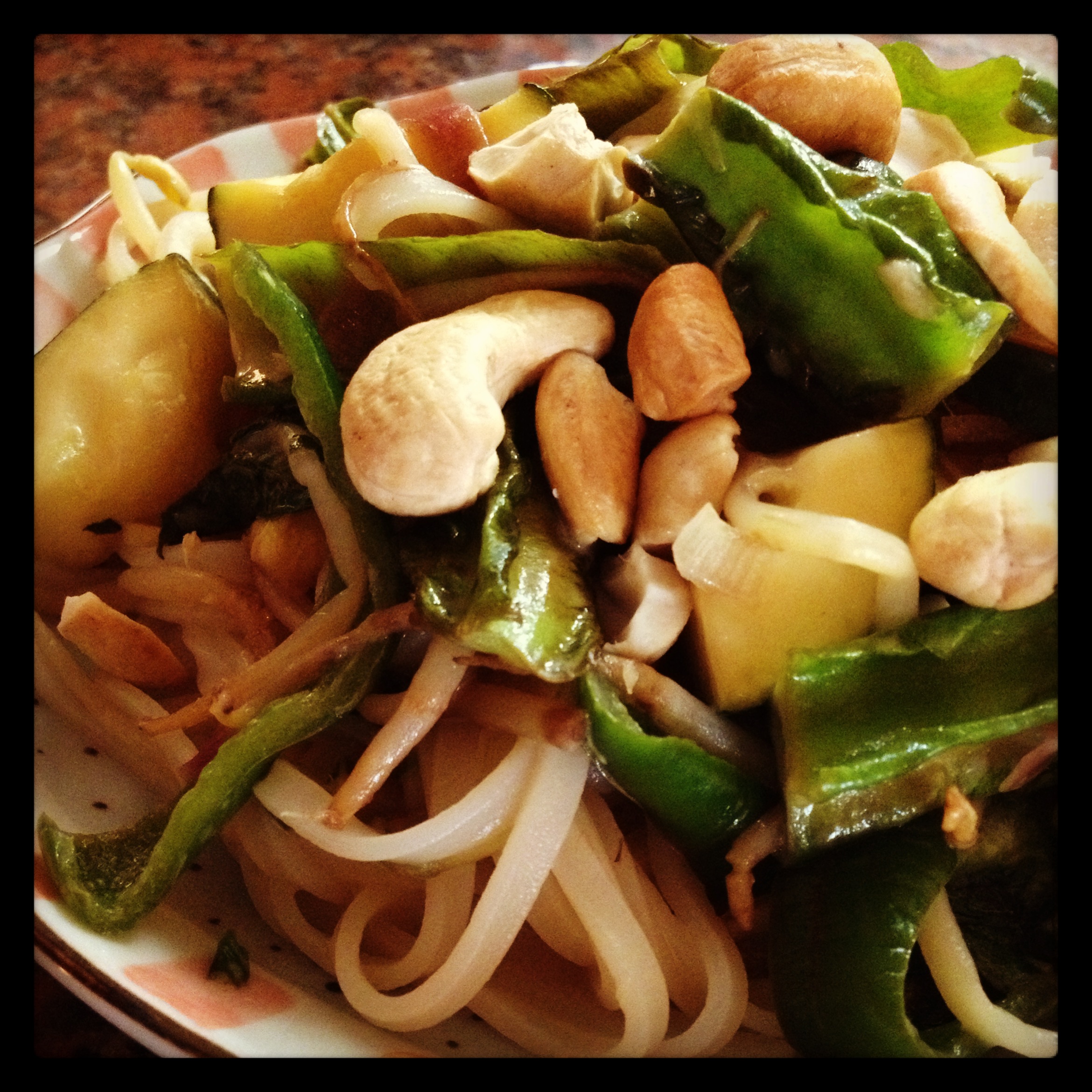 Heat the ghee then add the lemongrass and let this cook for a minute or two. Then add the urizun, bean sprouts, bells, and zucchini. Sauté these for five minutes, then add: coconut milk, soy sauce and shikuwasa juice. Once the veggies are tender, add the myoga, basil and cooked rice noodles. Mix this well and serve topped with broken cashew pieces.