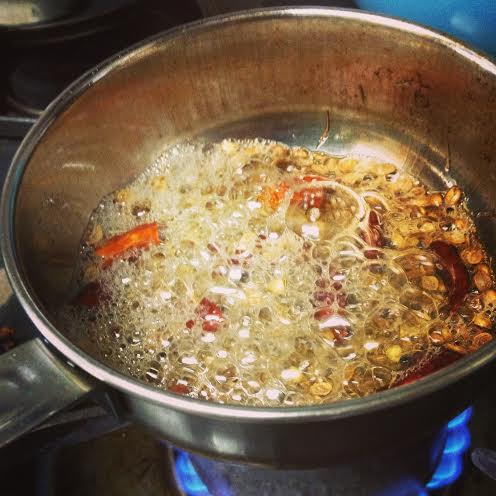 Blend the tomatoes, onion, and garlic in a food processor. Transfer to a pot and cook on medium heat until reduced by half. Heat the ghee in a small pan. Add the mustard seeds, and cook until they just start to pop. Add the crushed coriander, cumin, and chilis. Cook for an additional minute or two, until you can begin to smell the spices, then add the turmeric and cook for 30 more seconds. Take care not to burn the spices as this can happen quickly. Once the spices are done cooking, immediately dump the spiced ghee into the tomato mixture and stir well. Add salt to taste.